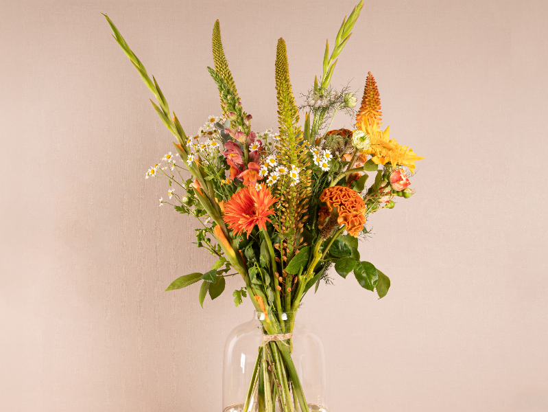Oranje boeket in warme tinten, los en speels geschikt met hoogteverschil en veldachtige uitstraling.